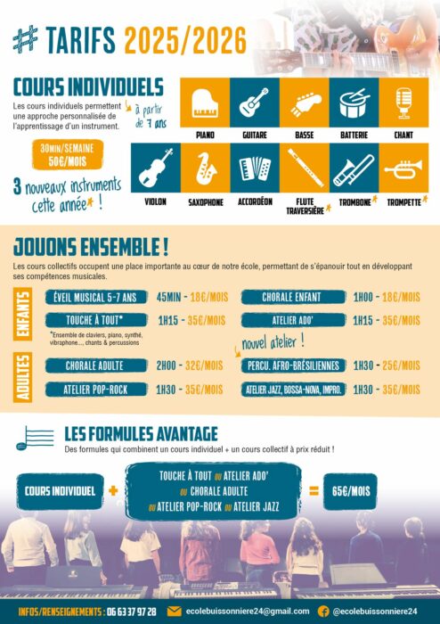 - Cours individuels: piano / chant / guitare / basse / batterie / violon (débutants) / accordéon / saxophone / trombone / trompette / flûte traversière (débutants)