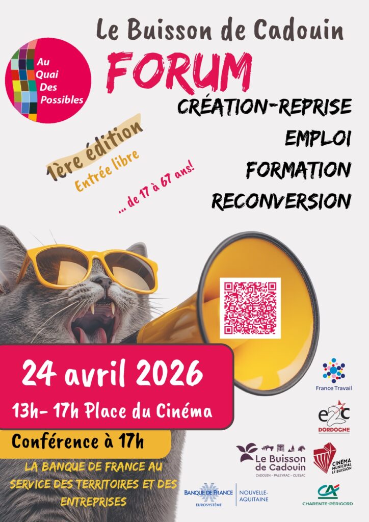SDIS 24, Irisccop, ANEFA…), font de ce forum un événement majeur de dynamisation de ce territoire essentiellement rural. Outre les ateliers proposés (recherche d’emploi, rédaction de CV .etc.), une conférence sur les aides à la création ou à la reprise d’entreprise s’y déroulera.La journée sera clôturée par une conférence du Directeur de la Banque de France au Cinéma du Buisson à 17h.